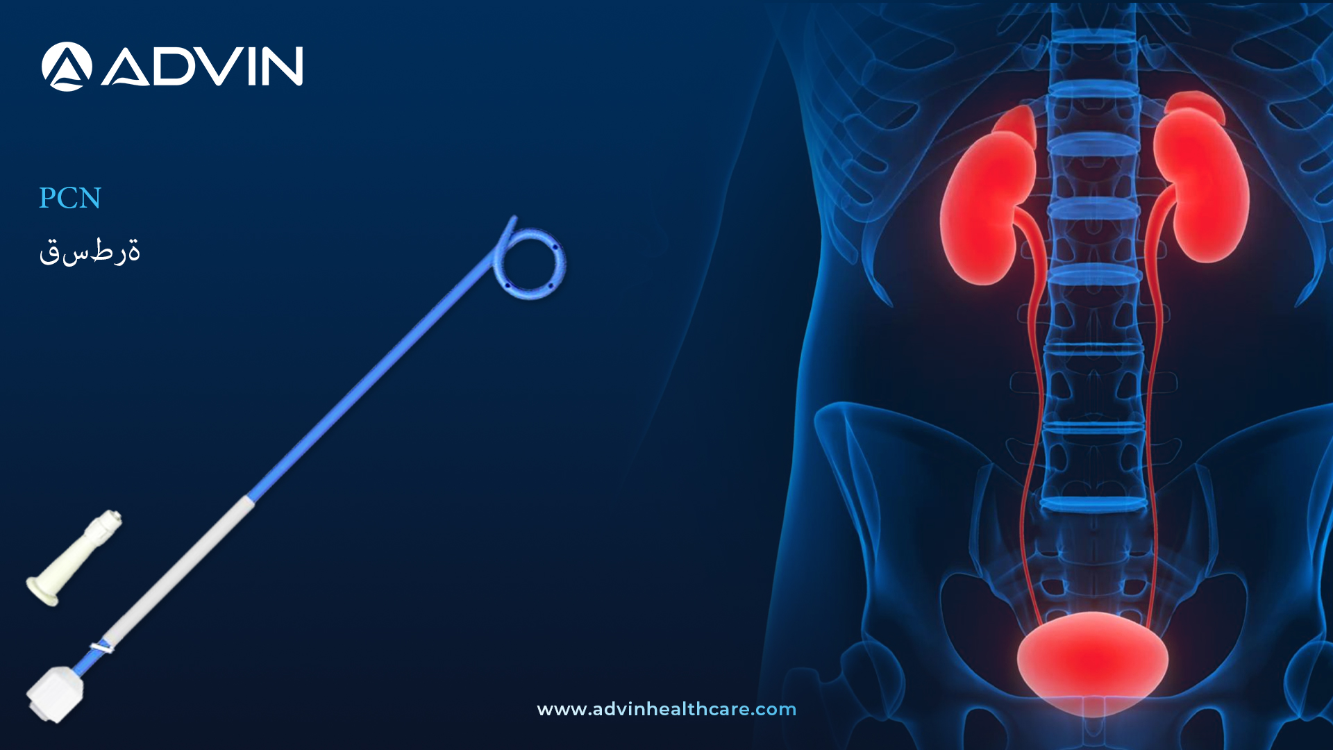 - تقدم شركة أدفين للرعاية الصحية قسطرة PCN المصممة لتصريف البول مؤقتًا وغسله مباشرة من الكلية في حالات انسداد الحالب السفلي. تُدخل هذه القسطرة عبر ثقب جلدي، وهي أداة أساسية في جراحة المسالك البولية التدخلية لتخفيف الضغط عن الكلى.