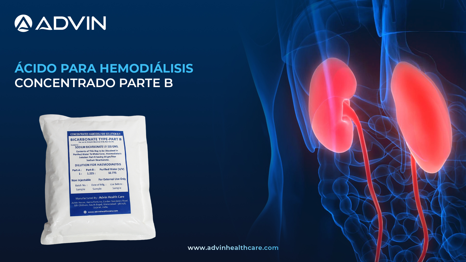 - Advin Health Care est un fabricant leader de poches de bicarbonate (Bi Bags), fournissant des solutions fiables et stériles pour une préparation précise du bicarbonate lors des procédures de dialyse.