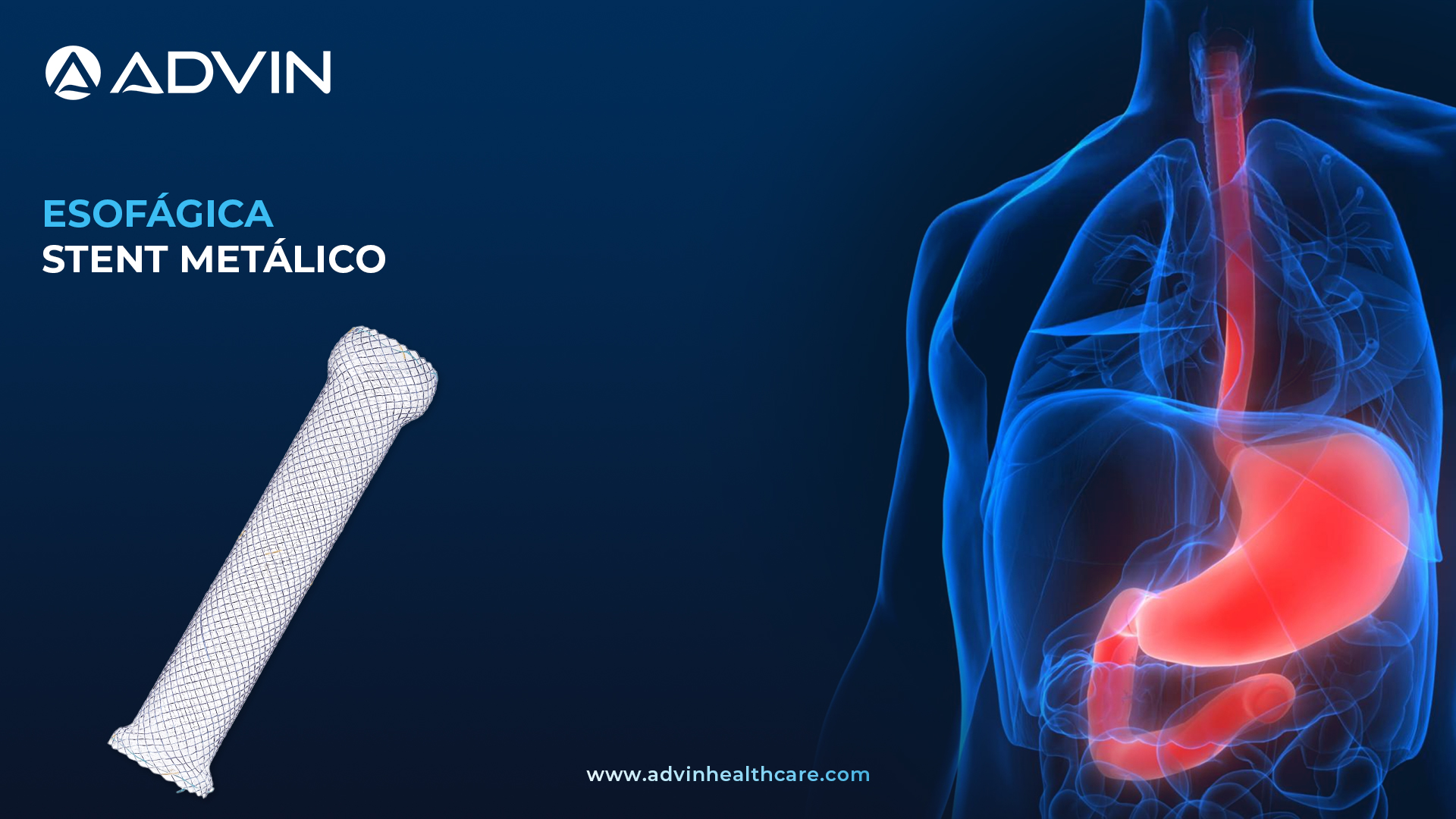 Advin Health Care es un fabricante líder de stents metálicos esofágicos, que ofrece soluciones que combinan precisión clínica y comodidad para el paciente. Estos stents están disponibles en una amplia gama de longitudes y diseños para adaptarse a diversas necesidades anatómicas y terapéuticas. Fabricados con materiales y tecnología de vanguardia, los stents de Advin gozan de la confianza de profesionales sanitarios de todo el mundo.