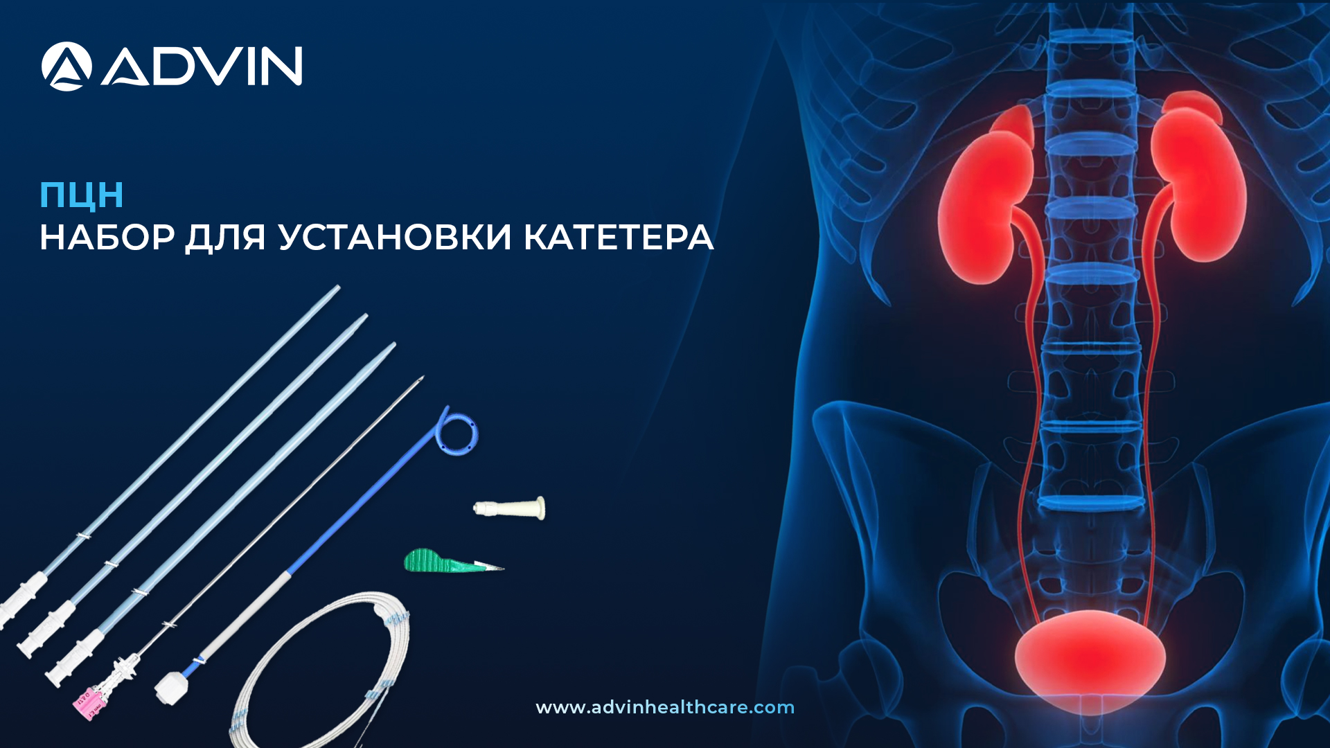 - Компания Advin Health Care предлагает набор катетеров для чрескожной нефростомии (PCN Catheter Set), предназначенный для временного оттока и промывания мочи непосредственно из почки в случаях дистальной обструкции мочеточника. Этот набор используется в малоинвазивных урологических процедурах для эффективного решения проблемы декомпрессии почки.